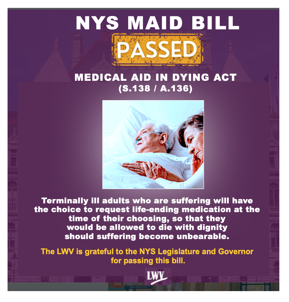 We appreciate all who advocated for passage of this humane bill, which enables terminally ill patients to choose peaceful and compassionate death. NY will become the 12th state to authorize medical aid in dying, requiring prognosis of 6 months or less to live, confirmed by 2 doctors. Each patient must make written request for end of life medication signed by 2 witnesses not beneficiaries of the patient's estate. This legislation was introduced in the Assembly by Rep. Paulin, a former Scarsdale LWV President, as a result of her family’s experience.